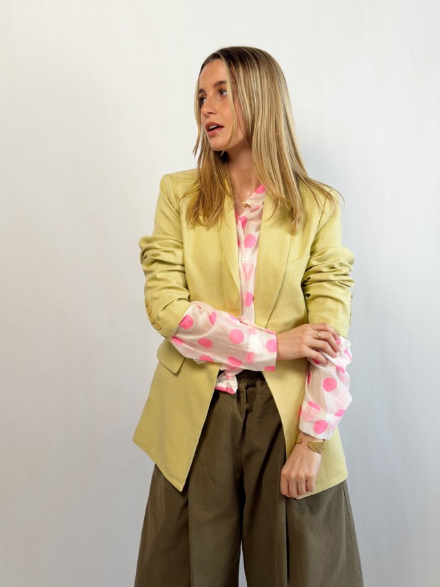 Blazer taille S, M et L. Margot porte la taille S et mesure 1M66.