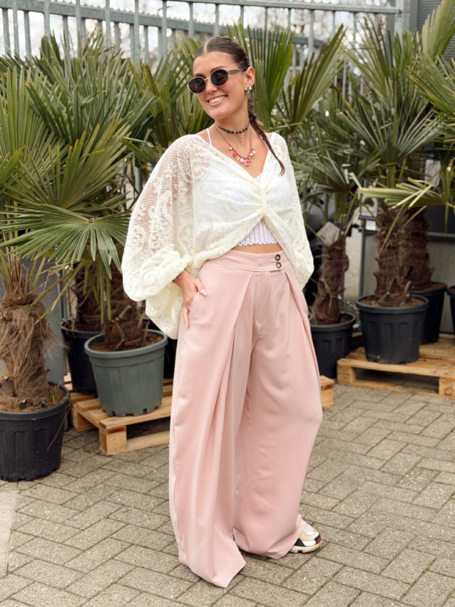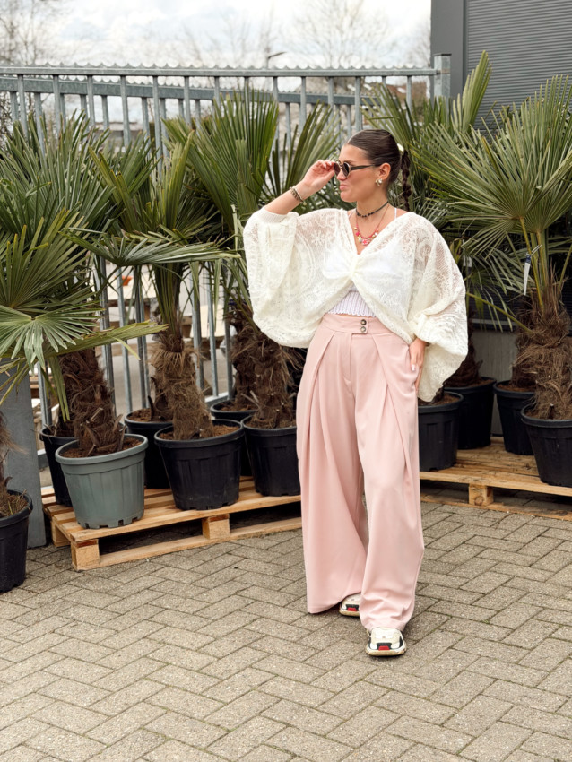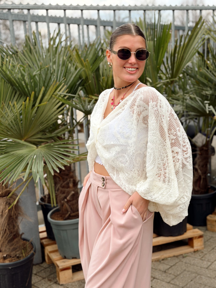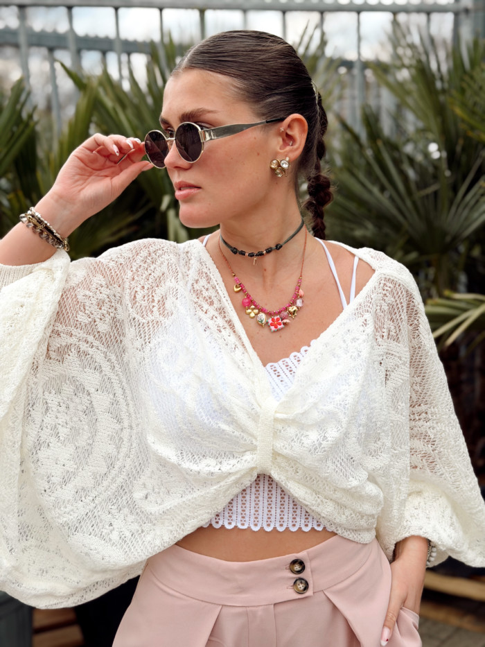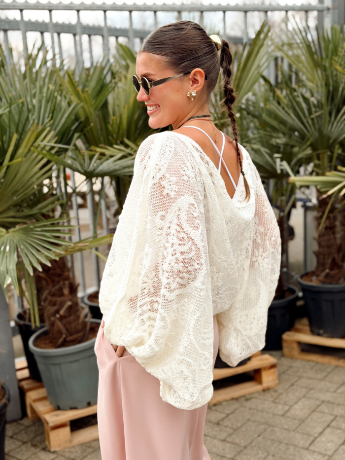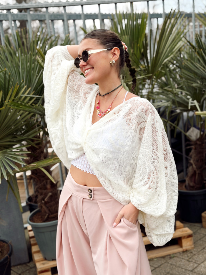 Blouse taille unique (convient du 36 au 42). Le top en dentelle n’est pas compris mais est disponible en boutique à 18 euros. Laurane mesure 1M59.