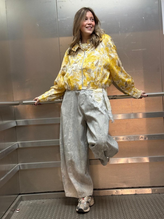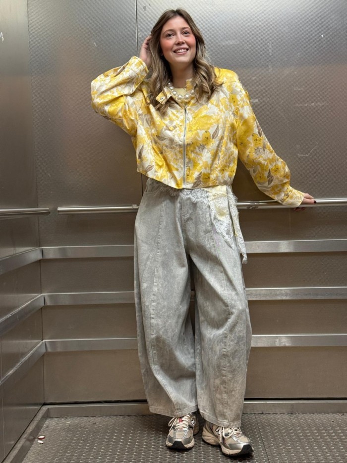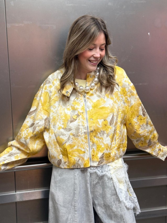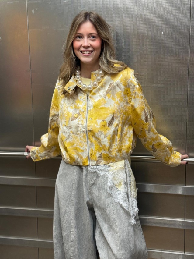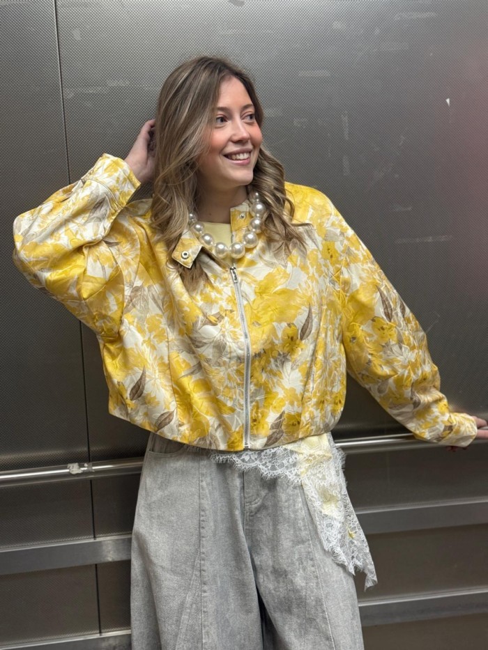 Blouson fleuris S, M et L. Oriane porte la taille S et mesure 1M63.