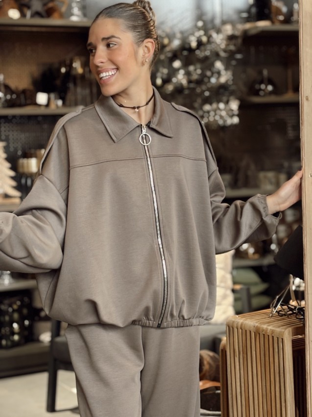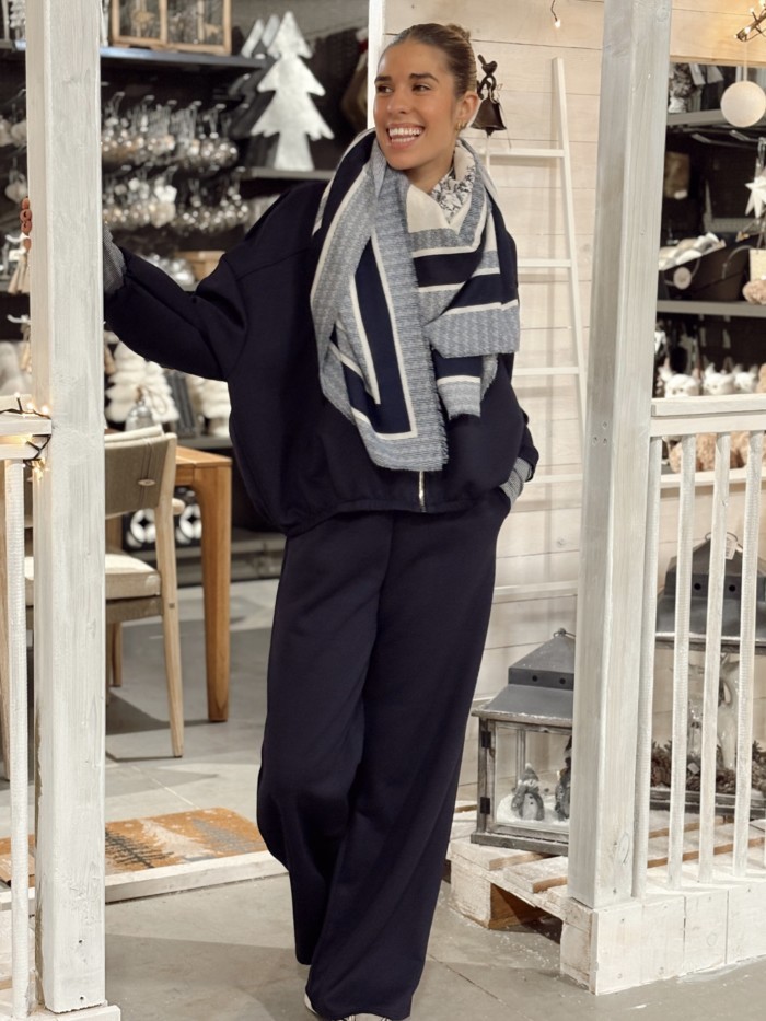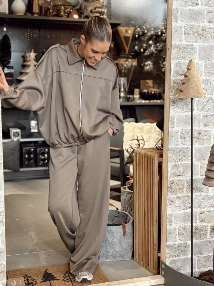 Ensemble pantalon + gilet taille unique (convient du 36 au 42). Il existe en beige, taupe et bleu marine. Le mannequin mesure 1M72.