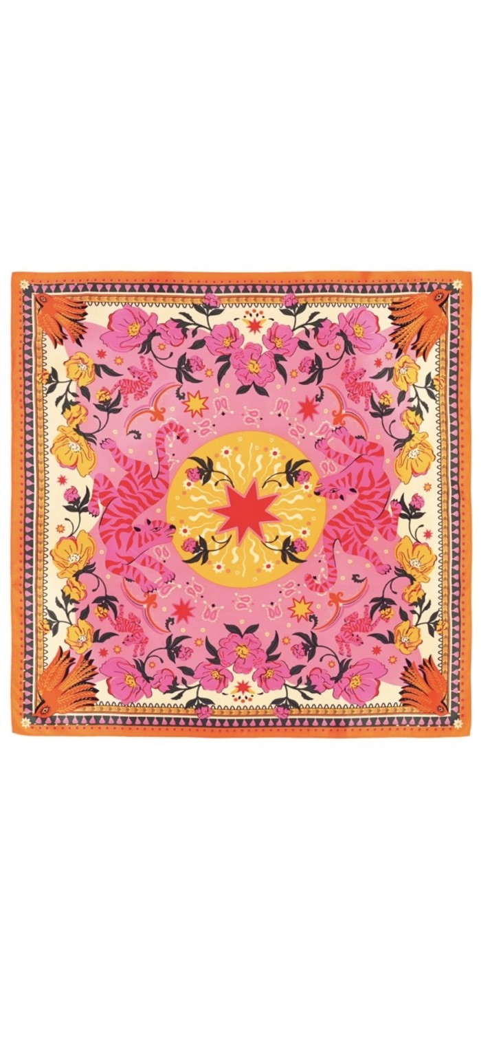 Articulé autour d’une étoile stylisée, l’imprimé BANDIDAS reprend les codes classiques du bandana et les réinvente en y mêlant un tigre docile et coloré, des fleurs estivales et des éléments d’esthétique mexicaine. Le résultat : une version girly aux influences multiples et lointaines. Décliné en trois couleurs, il est ici dans sa version rose avec des nuances de jaune, orange, rose, fuchsia, blanc et rouge.