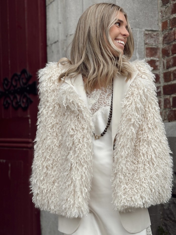 Fourrure taille unique (convient du 36 au 42). Le mannequin mesure 1M74. Existe en blanc cassé comme sur la photo et en beige (légèrement plus foncé).