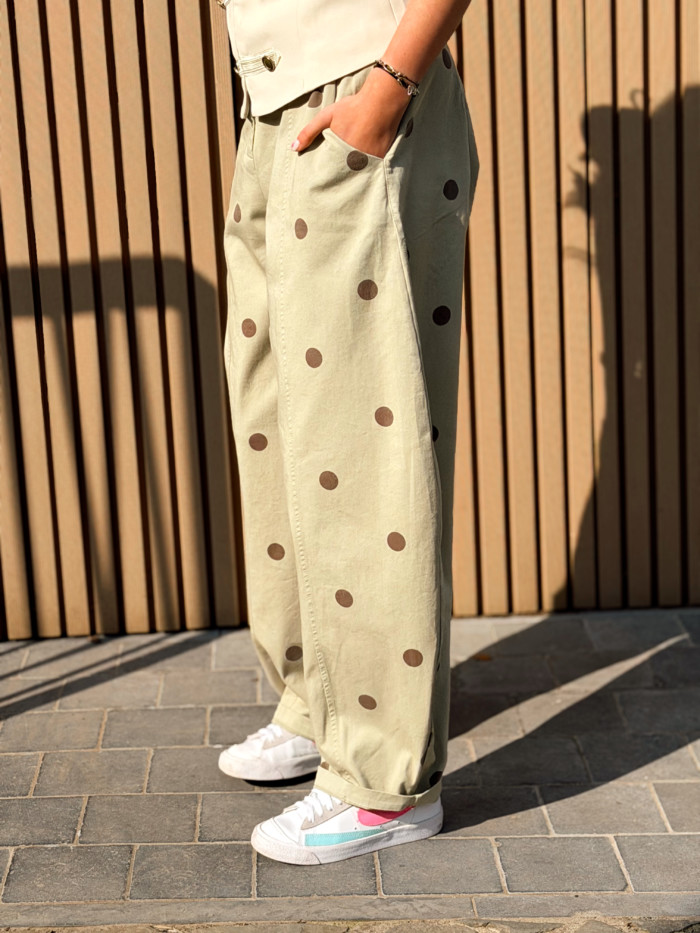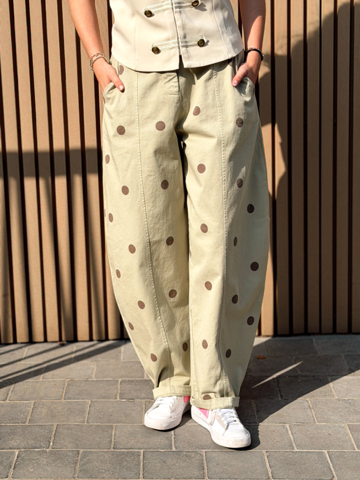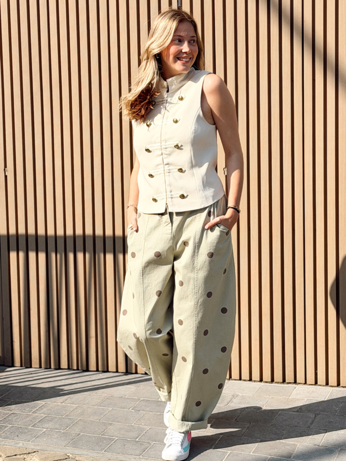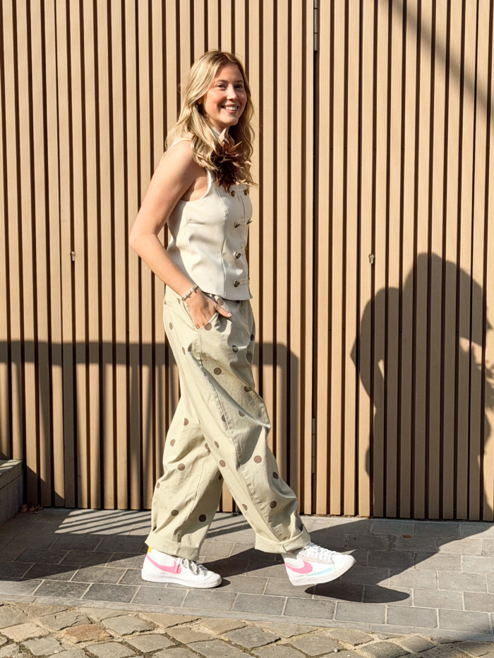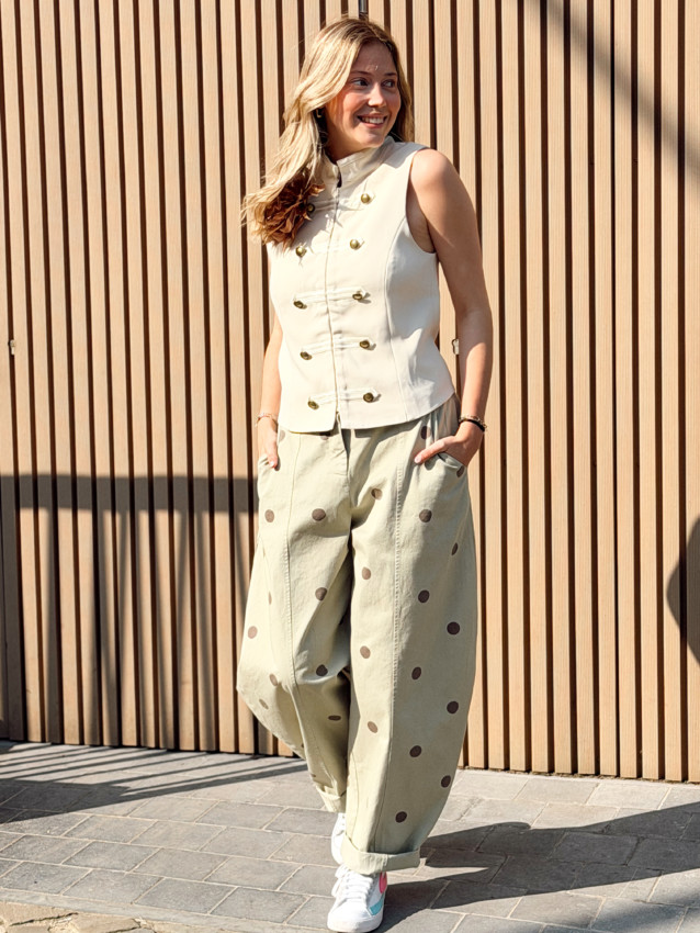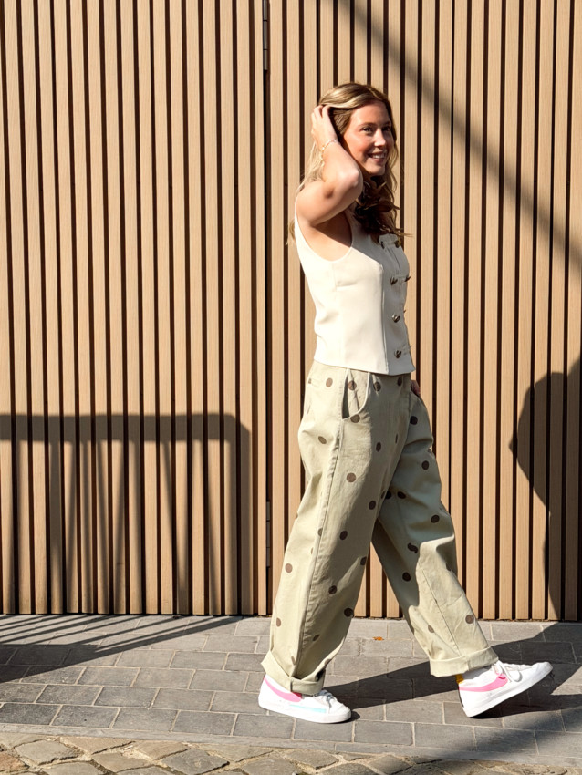 Pantalon taille S/M et M/L. Oriane porte la taille S/M et mesure 1M63.
