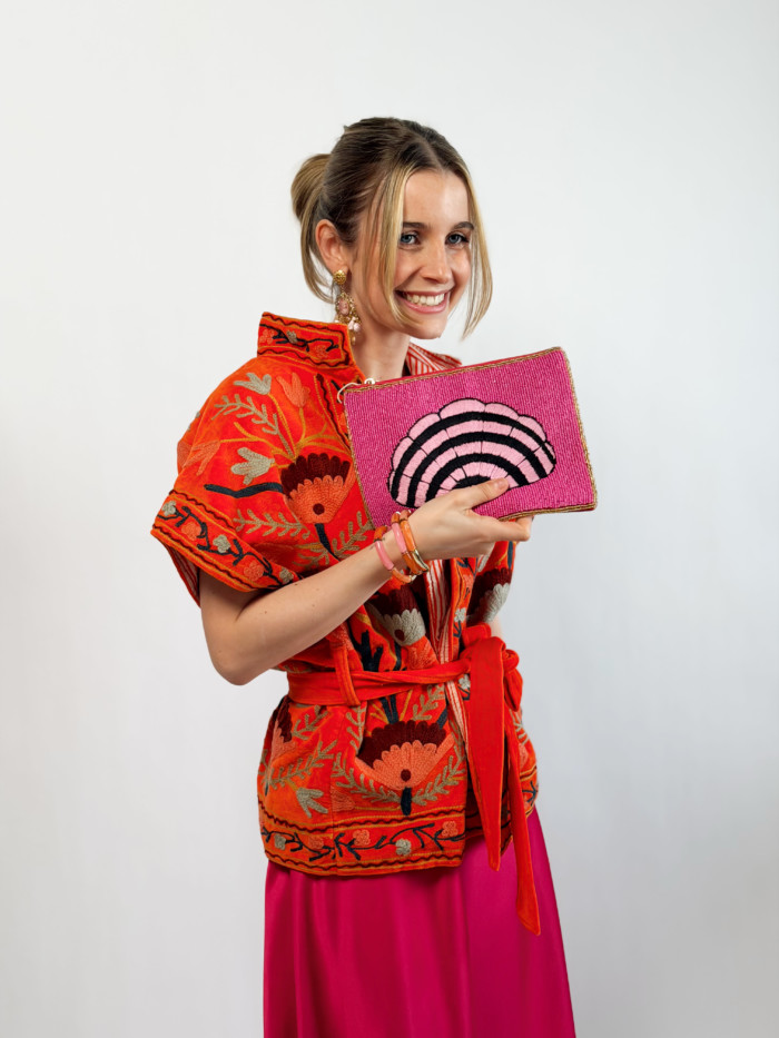 Zippée sur le dessus et accessoirisé d’une anse latérale, la pochette Céleste de la marque Wild affiche un fond uni entièrement brodé de perles, encadré d’une ligne de perles dorées et sublimé par un grand coquillage très graphique structurée de lignes contrastées. Elle se porte près du corps, à la main ou sous le bras, exhibant ainsi fièrement un coquillage stylisé entièrement tissé à la main.