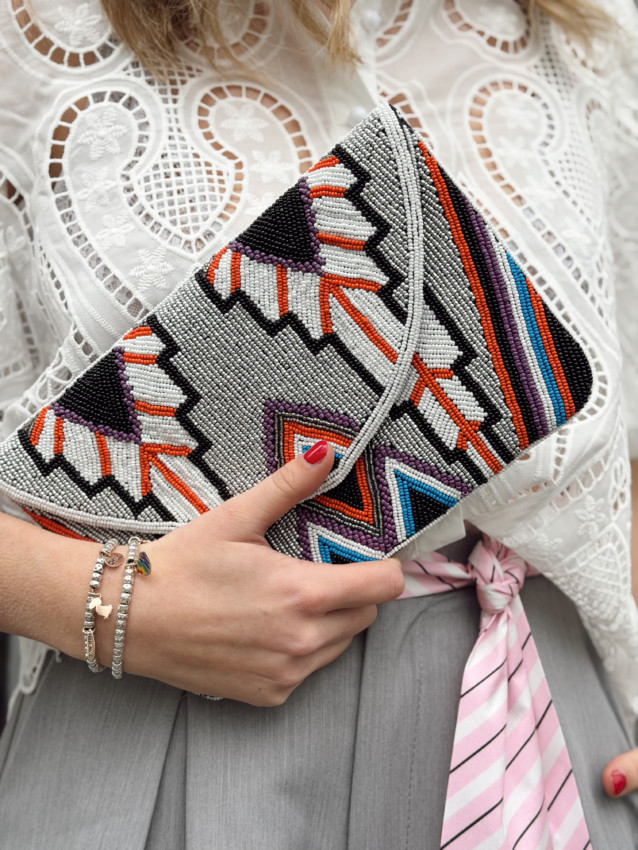 Dans une forme enveloppe réinterprétée, entièrement brodée à la main de perles, elle se ferme par un grand rabat au contour arrondi et brodé de perles blanches.
