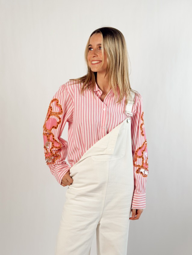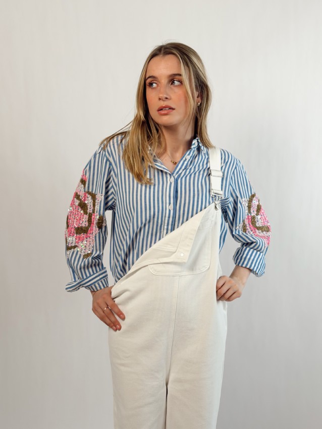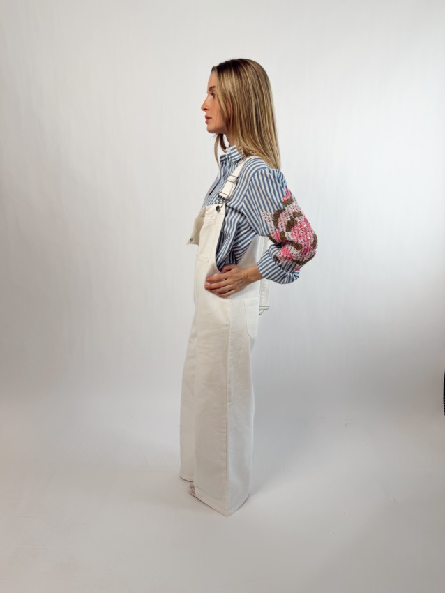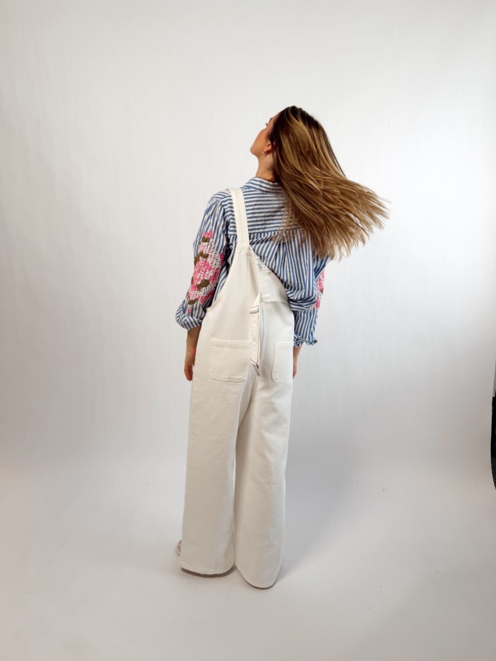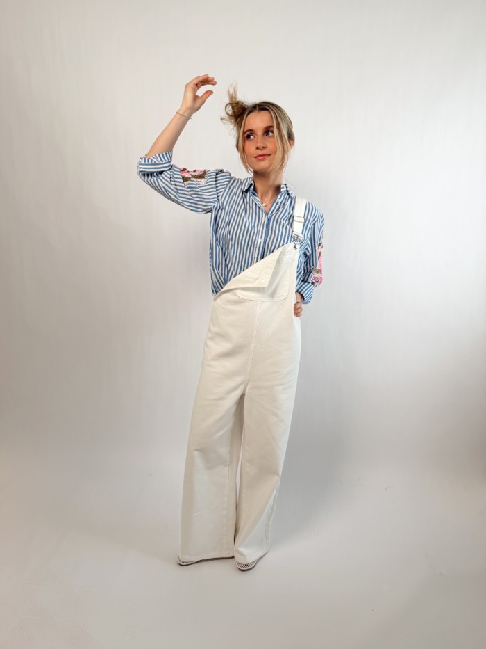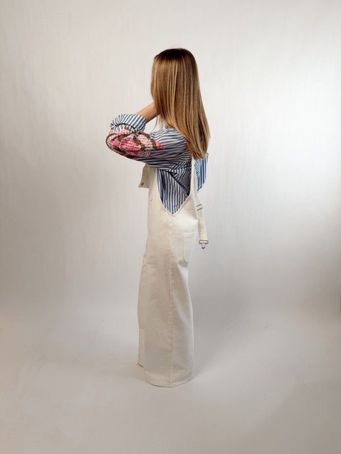 Salopette taille S, M et L. Margot porte la taille S et mesure 1M66.