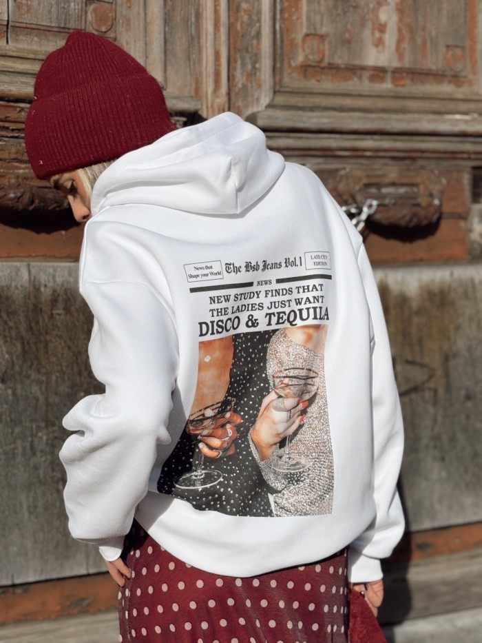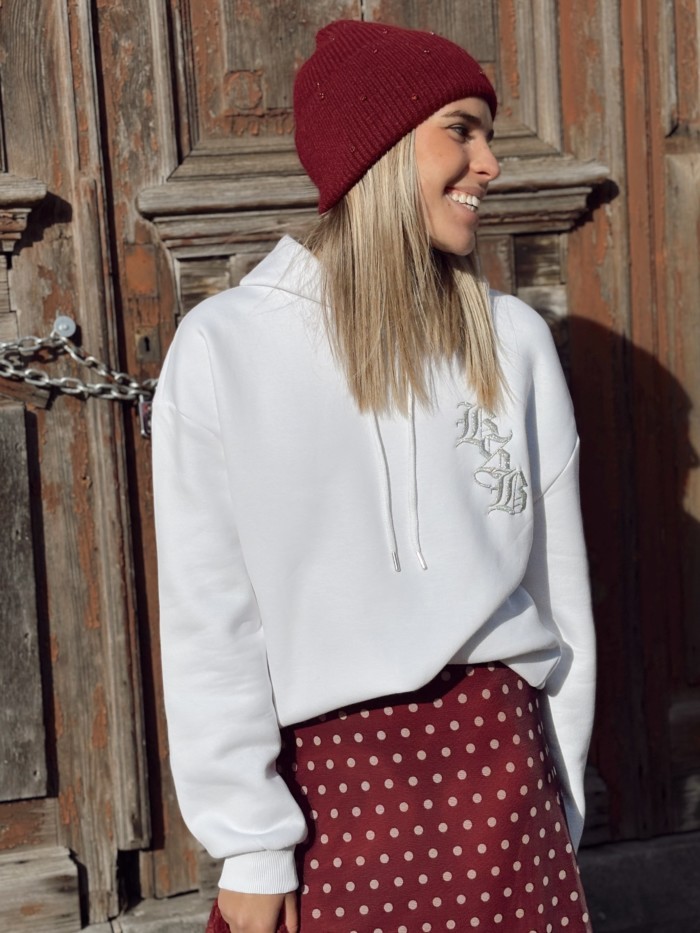 Sweat à capuche taille S ou M (assez oversize). Le mannequin mesure 1m74.
