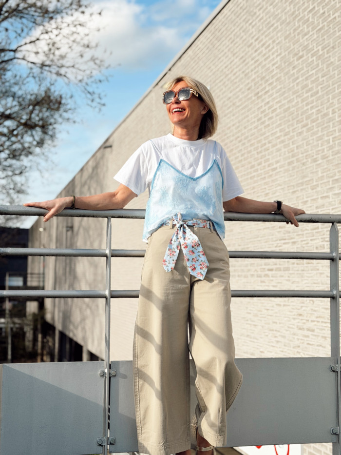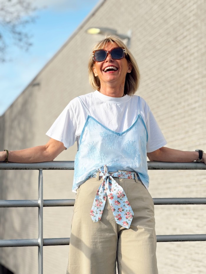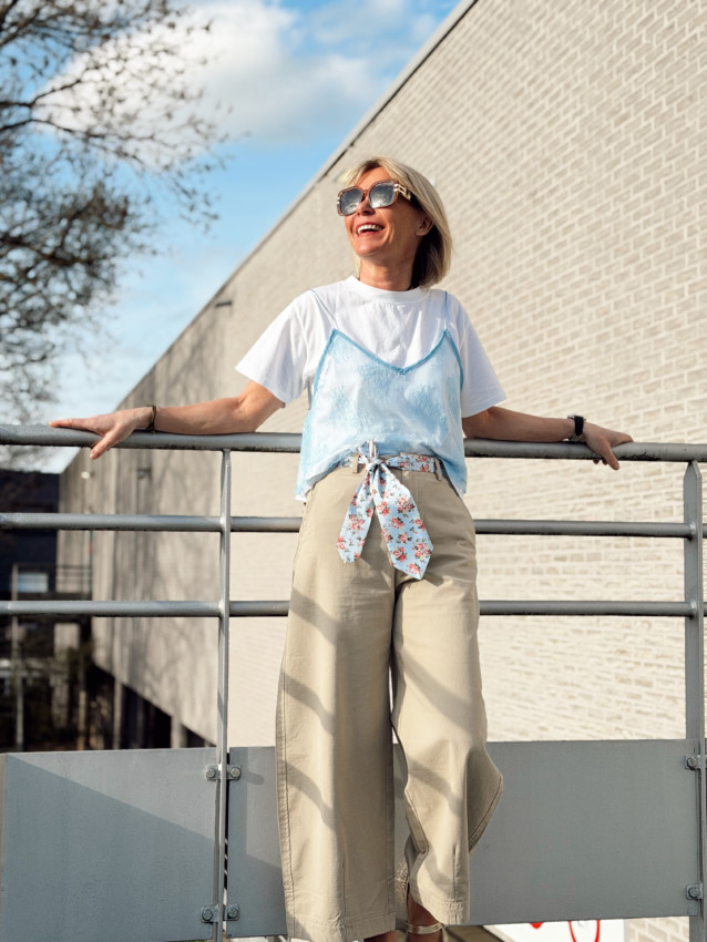T-shirt et top en dentelle taille unique (convient du 34 au 40). Il est disponible en rose et en bleu ciel. Cateline mesure 1M69.