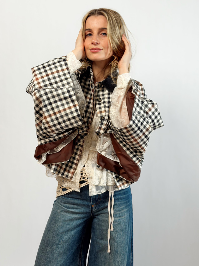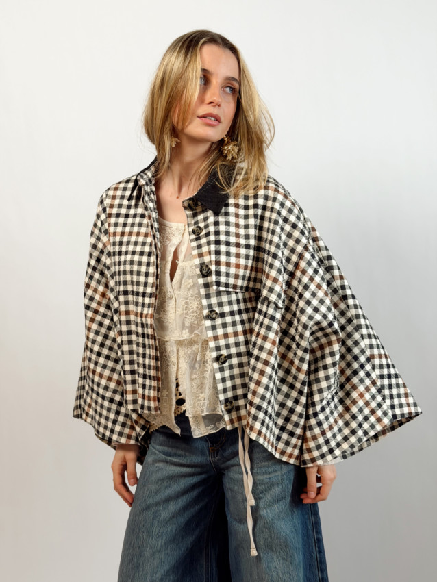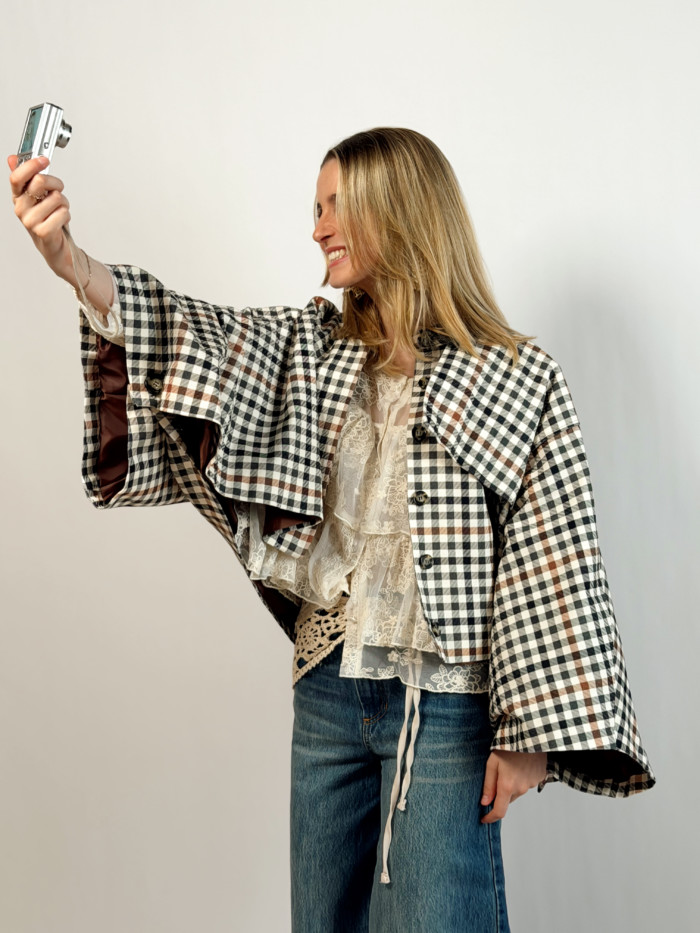 Veste taille S uniquement (oversize, convient du 34 au 42). Margot mesure 1M66 et porte cette taille.